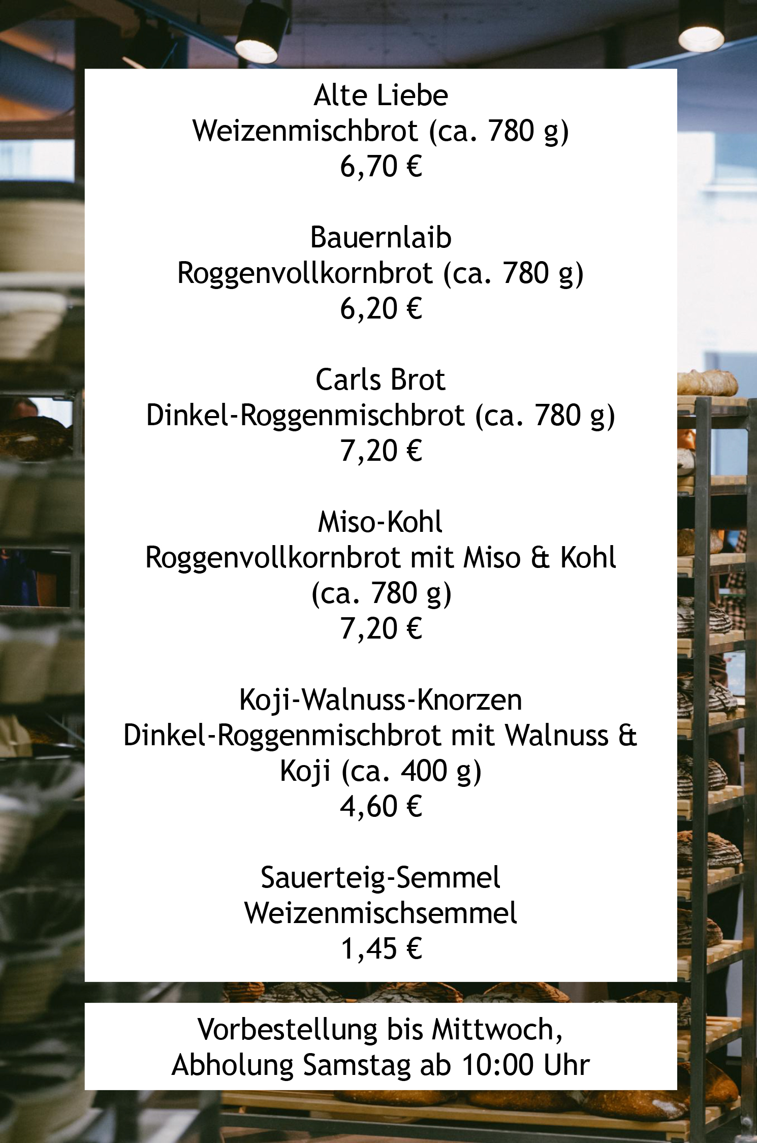 Vorbestellung bis Mittwoch, Abholung Samstag ab 10:00 Uhr.
